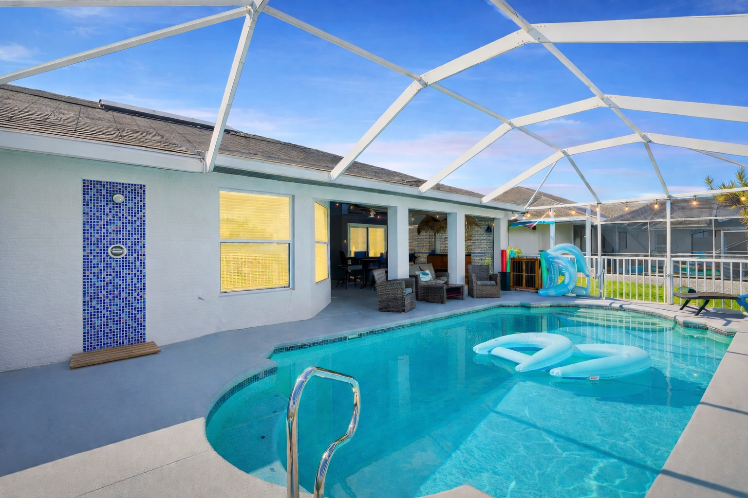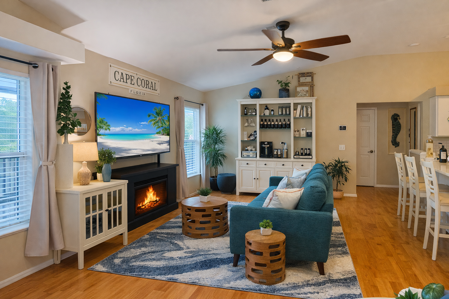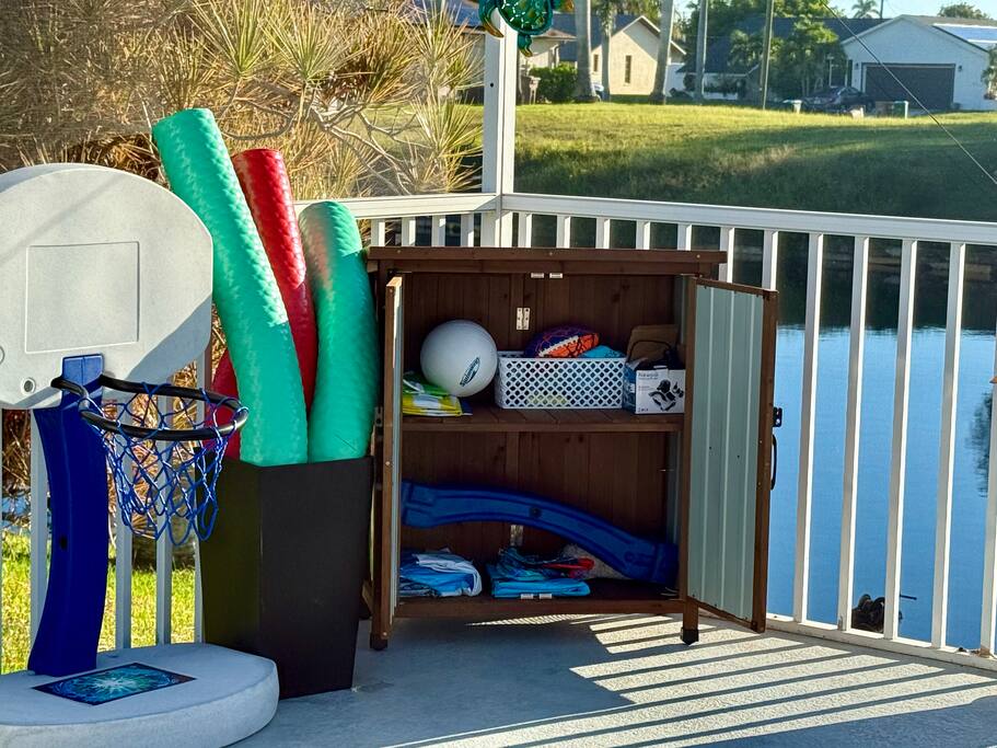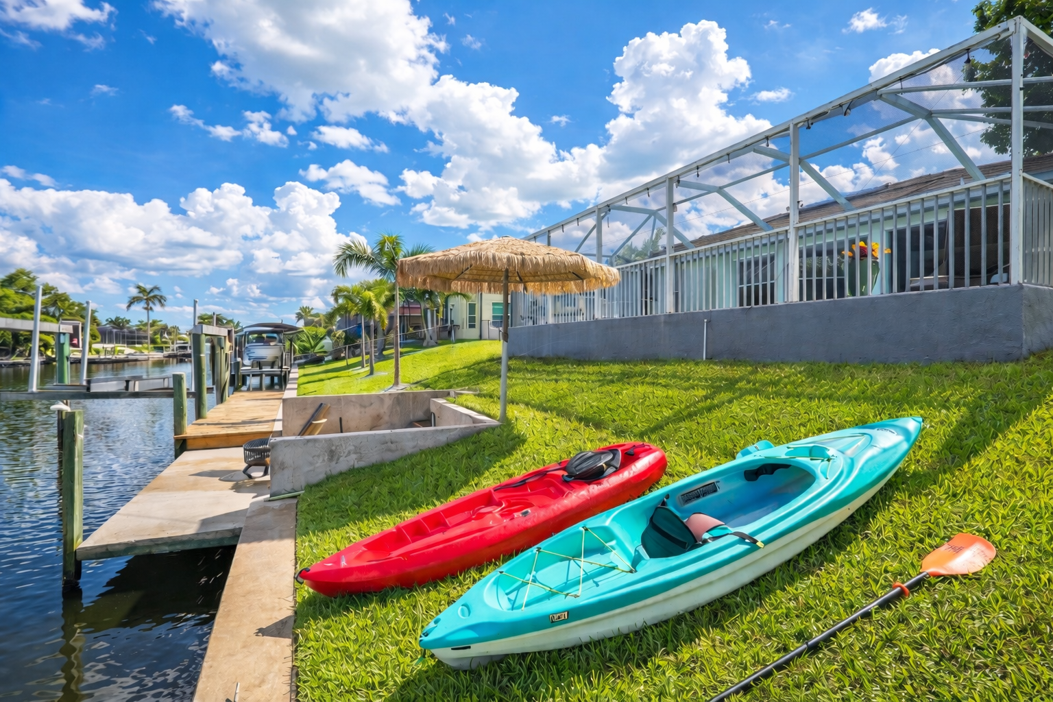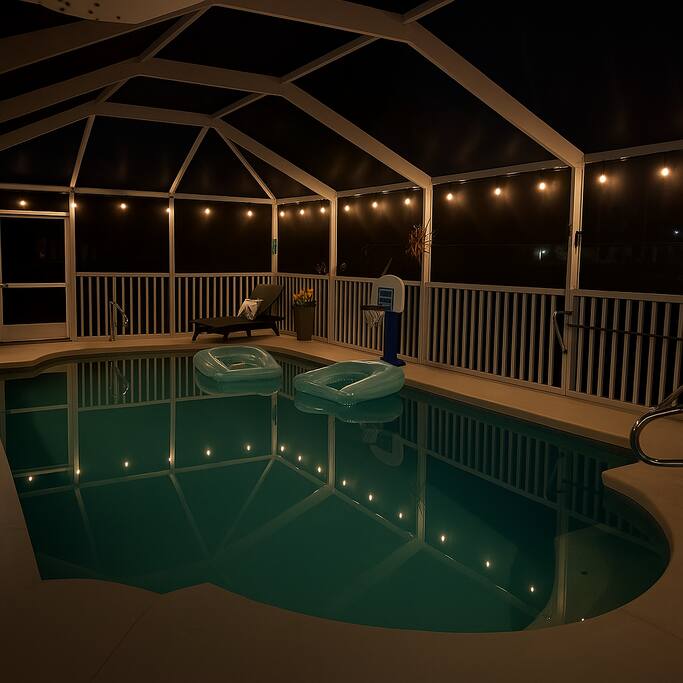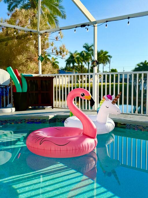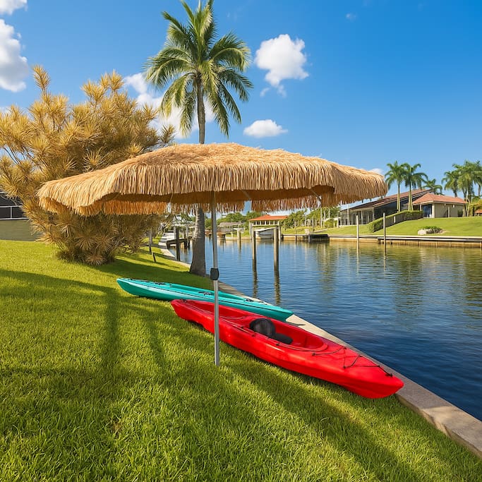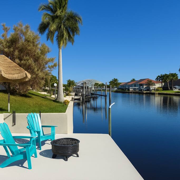 🏡 Property Highlights: • Heated solar pool overlooking the canal (cost included) • Private dock & boat lift – bring your boat! • Covered poolside lanai w/ customizable string lights • Arcade + game room (fun for kids & adults!) • 3 bedrooms / 2 baths with new luxury mattresses 🛶 Amenities for Adventure: • Kayaks and paddles included • Gulf access for boating, fishing, or manatee watching 2 adult cruiser bicycles and two children’s bikes. 🌴 Perfect Location: • Minutes to Cape Coral Beach, Tarpon Point Marina, Rumrunners & High Tide Social House • Short drive to Sanibel, Captiva, and Fort Myers Beach.